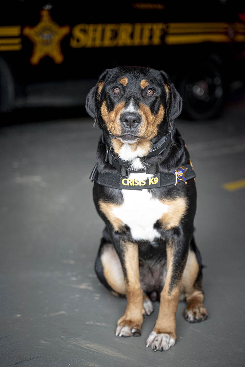 Our gentle giant is Luna, a 9-month-old Greater Swiss Mountain Dog. True to her breed, she is very loving and loyal. She also loves embracing her goofy side when she is working at her high school (Franklin Heights) and when she’s running around on her farm. Despite having a high energy personality, Luna is eager to please and only wants to do the right thing.