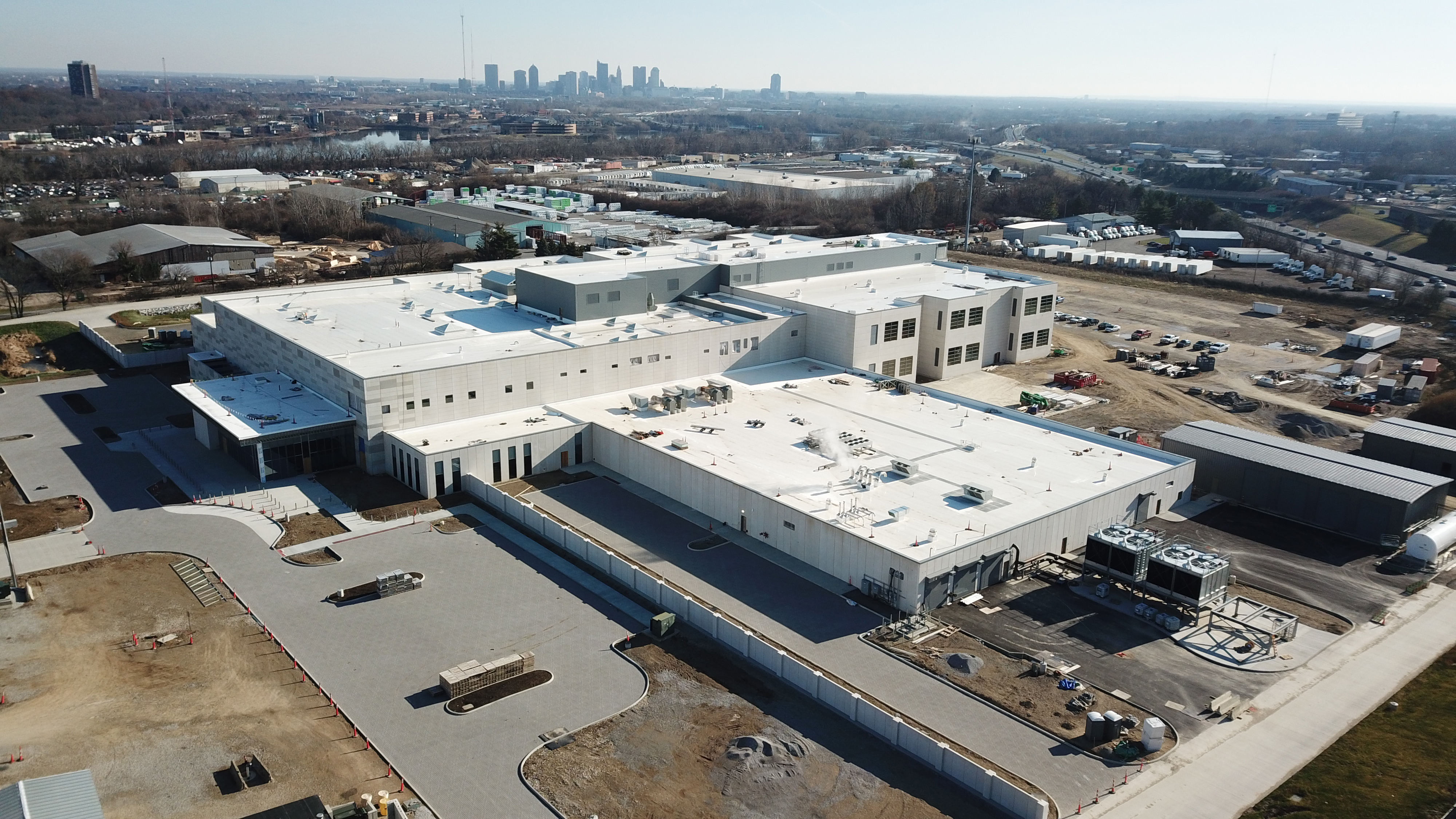 Looking east towards downtown Columbus. Installation of the permeable paver parking lot system is complete.