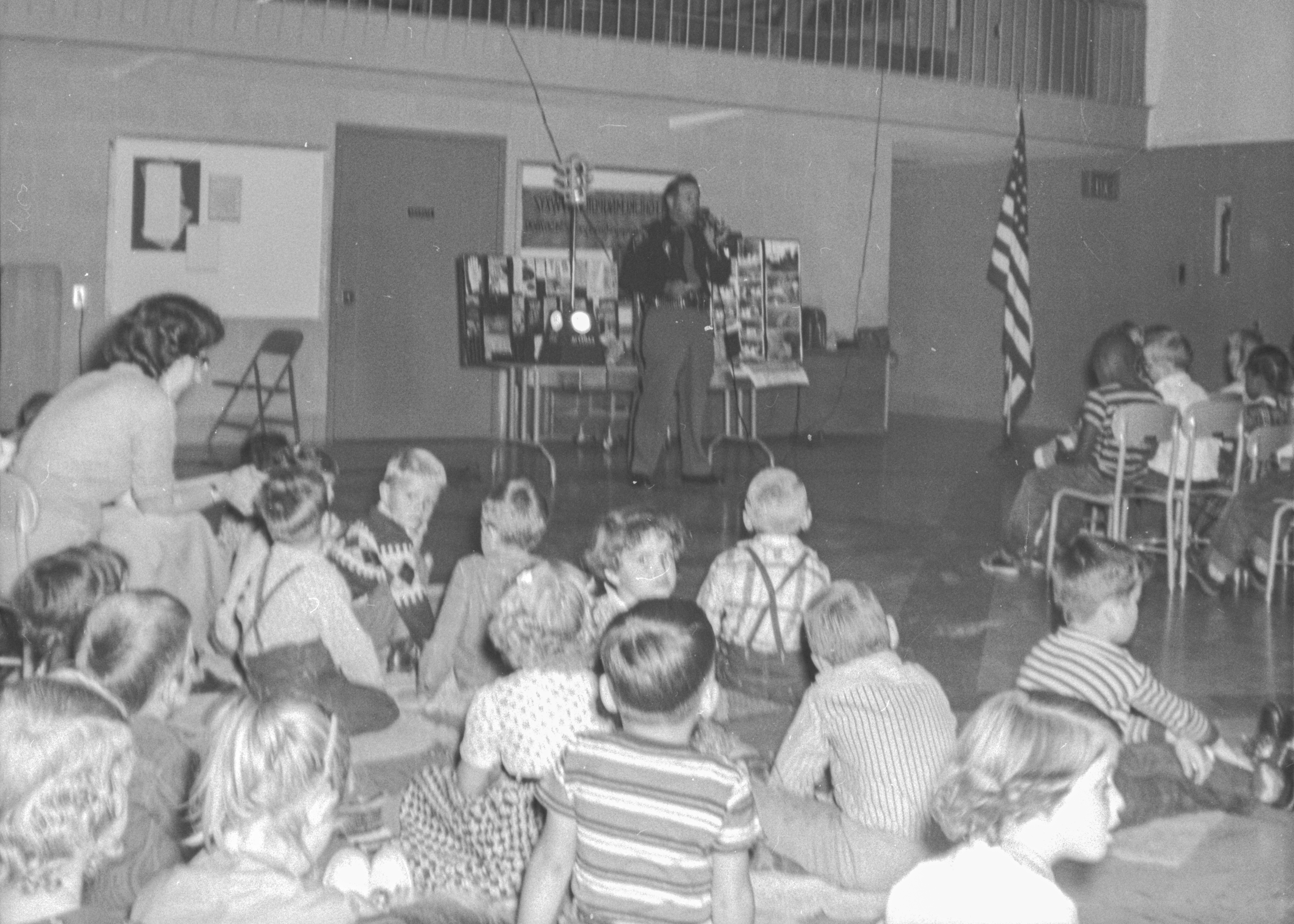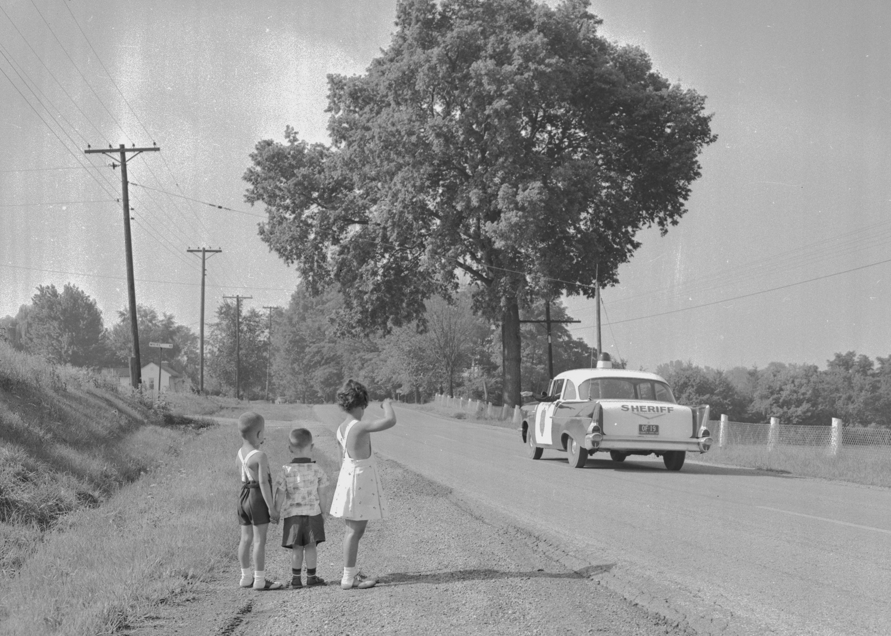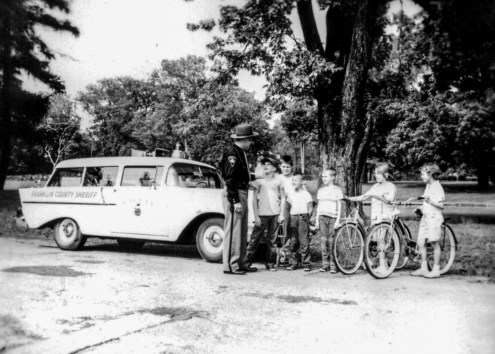 Pictured here is a Deputy speaking with elementary school children during a safety campaign in October of 1956.